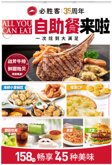 必胜客再度推出了备受欢迎的“自助餐”活动,每年限时为顾客提供美味盛宴。活动菜单包括美味的战斧牛排、风味十足的海鲜和具有异域风情的榴莲披萨等。该活动市场反响积极,成功吸引了一大批新的年轻顾客,他们渴望品尝创新、多样化的餐品。