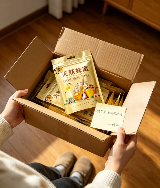 拆开箱子,里面整整齐齐放着十几袋桂花蜜。