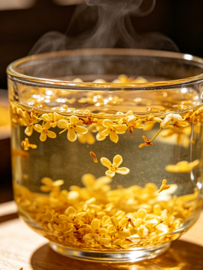 干桂花遇水舒展,金黄的花瓣在杯里打转。
