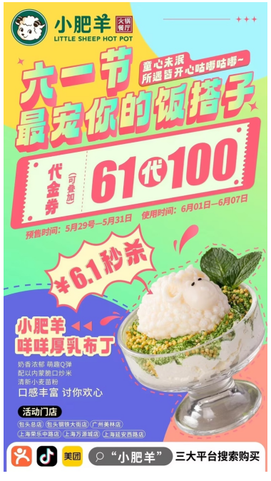 在充满童趣的儿童节,小肥羊为大小孩子们带来了一场欢乐的美食盛宴。孩子们脸上洋溢着幸福的笑容,大人们也在这欢乐的氛围中重拾了童年的纯真。小肥羊于近期限定推出咩咩厚乳布丁,奶香浓郁、萌趣Q弹,配以内蒙脆口炒米,清新小麦苗粉,口感丰富。这款布丁还以小肥羊品牌标志性的“咩咩”形象为设计灵感,活动期间更可享6.1元福利秒杀。