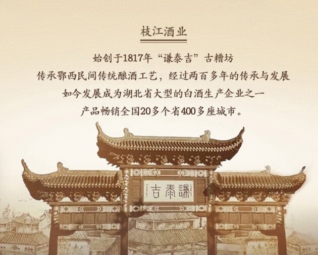 枝江酒业起源于1817年在古镇江口创办的“谦泰吉”古槽坊,寓意“谦和、国泰、吉祥”。历经200余年的创新变革和匠心传承,枝江酒业现拥有马店和江口两大厂区,占地面积1000余亩,建筑面积200多万平方米,拥有5个酿造车间,3万多个大型贮酒陶坛,年原酒储存量3万余吨。
