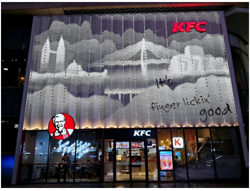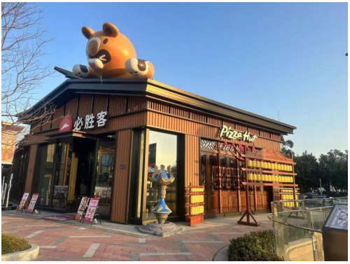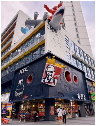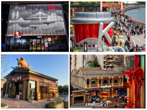 眼球经济、打卡经济流行的今天,标准化的门店已经不能满足百胜中国“跃动”的心。致力做创新的餐饮先锋,其旗下品牌肯德基、必胜客、Lavazza让视觉惊喜从餐厅的第一眼开始:悬在空中的大型全家桶,爬上屋顶的热门IP角色、膨胀感的咖啡杯快闪造型……那些熟悉又变化的门头、店招形象,不仅让餐厅更容易“被看见”,还充分挖掘城市城镇街区文化,融入环境,与区域功能、人文特色相得益彰,更深刻地表达品牌认知,链接起时下的生活方式、流行文化,与时代潮流共起舞。