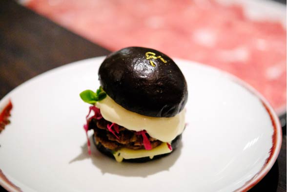 中间再加上用西班牙霞多丽葡萄酿造的葡萄酒醋泡制的紫甘蓝泡菜,来平衡整个口味的层次感。再加入车打芝士,以及用车打芝士、马苏里拉芝士等混合芝士调成的芝士泡沫。用加入了新鲜墨鱼汁揉成的面包烘烤而成的汉堡面包夹住,配上一点绿色蔬菜。