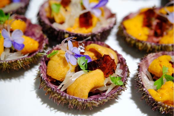 选择新鲜的马粪海胆,现场分割,取出海胆,留下外壳。将和牛里脊部位做成塔塔,其中加如法国酸豆、法国干葱碎、新鲜香草,以及少许大藏芥末汁进行调味,最后配上海胆之后,酿回海胆壳中送到客人面前。