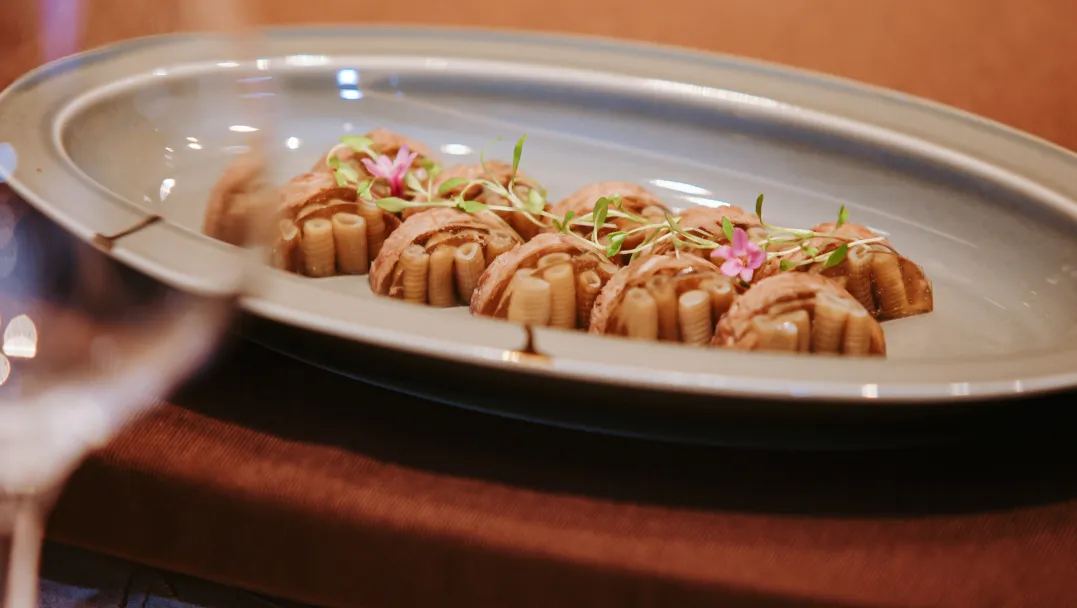「松茸连江鲍鱼澳洲金钱肉」选用了澳洲金钱腱作为核心食材。金钱腱位于牛前腿的小腿内,是一块修长而富有韧性的腱子肉,带有细腻的纹理和自然胶质。