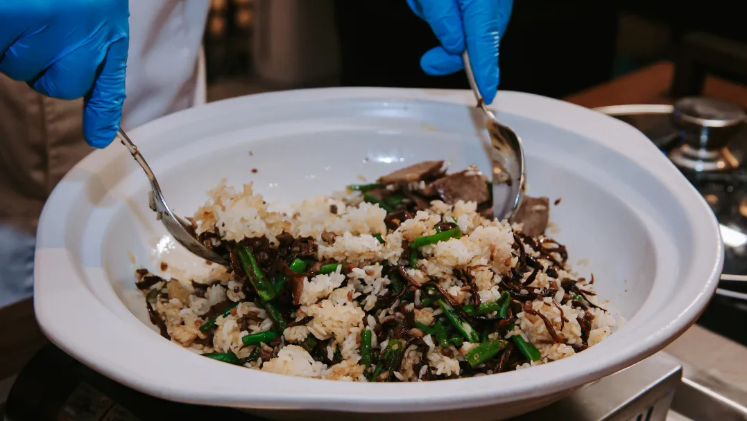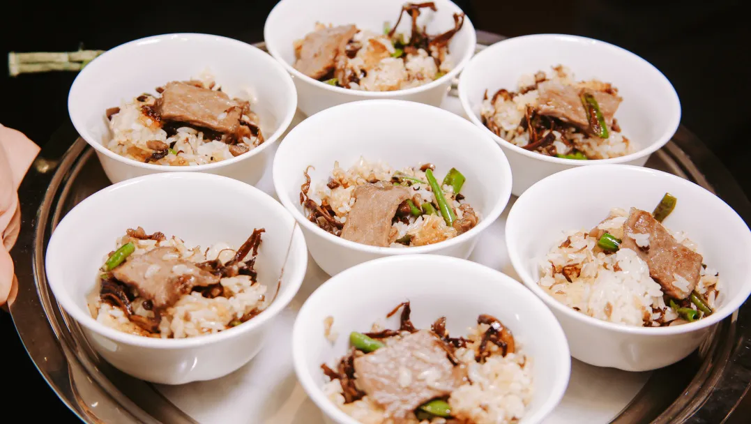 「油鸡枞澳洲和牛煲仔饭」是对传统煲仔饭的创新诠释。精选澳洲和牛,经过低温慢煮和猛火快炒两种烹饪策略后融合为一道复合风味美馔。