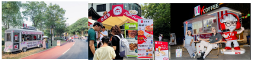 肯德基餐车快速响应客流需求,武汉东湖、恩施大峡谷等热门旅游景点均有肯德基餐车身影。西安肯德基联动长安国际影城快闪餐车,即时可取。天津意风区、津湾广场、动物园的肯德基餐车……解锁户外轻餐饮的新模式。还有上海佘山森林公园的必胜客餐车化身"森林补给站",这些动态场景布局,使品牌触角延伸至城市毛细血管,构建起“15分钟文旅消费生态圈”。