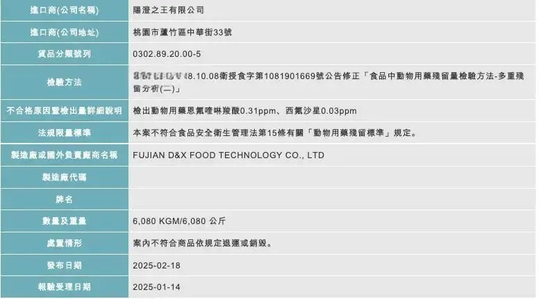 依台湾地区食品安全法规,恩诺沙星的检出限为0.1ppm,而西氟沙星在水产品中不得检出,这批6吨的黄鱼被原样退回厦门。