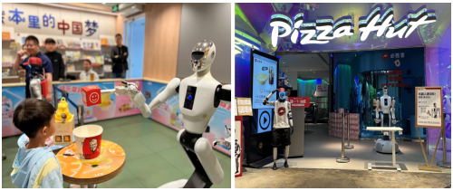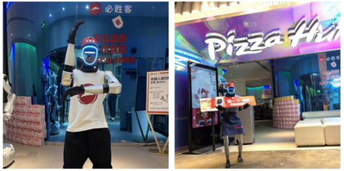 同样,在必胜客上海美罗城店,一名特殊的“服务员”给消费者带来了新奇的消费体验。它是宇树机器人,它通过视觉传感器与语音播报系统,化身“迎宾员”,能通过视觉传感器在0.5米至1.2米范围内主动识别人物,为消费者介绍餐厅美食,还可以在餐厅内为食客提供舞蹈表演与趣味互动,当顾客发出“必胜”“必胜客”“披萨我最爱”等不同的“暗号”时,宇树机器人则会摆出相应的姿势,供大家打卡留念。