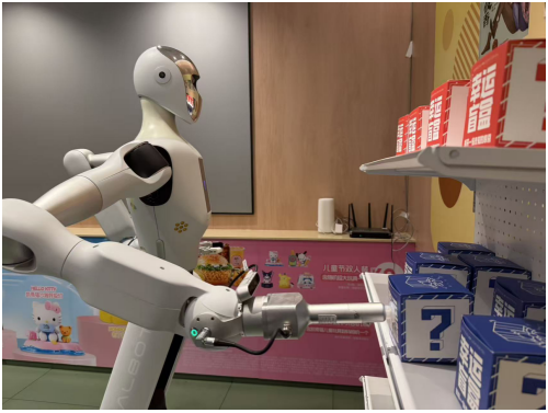 与此同时,“肯二”则肩负起“幸运小管家”的重任,它灵活的机械臂在指令下精准运转,为参与活动的小朋友拿取色彩缤纷的玩具:三丽鸥相机、奇奇同款文具盒、便签纸、蜡笔、画板等。每一次抽取与拆封都充满未知与期待,现场欢呼声此起彼伏。