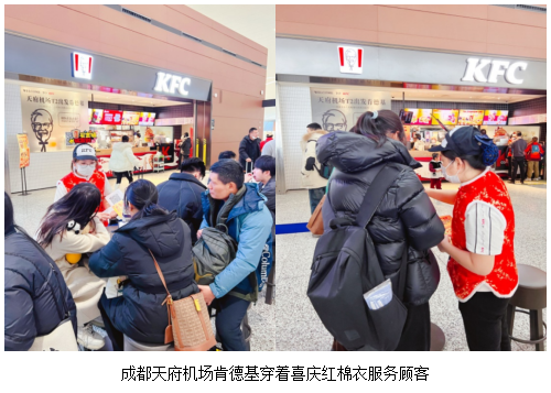 在成都天府国际机场安检区内和安检区外的两家肯德基餐厅,90名肯德基员工严阵以待,迎接在天府国际机场的第三个春运。穿上带着“年味”的喜庆红棉背心,从清晨05:30开始接待第一位旅客,到22:30分送走最后一名旅客,肯德基餐厅员工尽心为每一位到店的旅客提供美味餐食和暖心服务。