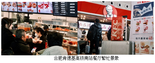 同样开放“高铁订餐”的还有肯德基安徽合肥高铁南站店。面对春运期间的巨大压力,他们用心经营,为广大旅客提供安全、高效、优质的服务。这些餐厅成为旅客们回家路上的一处温馨驿站,让他们感受到品牌“永远好滋味”的关怀和温暖。