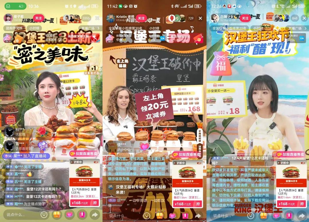 新品包含「脆辣皇金鸡腿堡」和「特辣皇金鸡腿堡」两种新口味,并在抖音平台借助整合营销联合发售。围绕新品发售打造爆品的核心目标,汉堡王与抖音平台IP定制合作,邀请 密子君、Kristin老师、白醋少女 等大V进行花式种草,开展明星超头大场促进转化,利用广告产品在爆发期贯穿宣传。