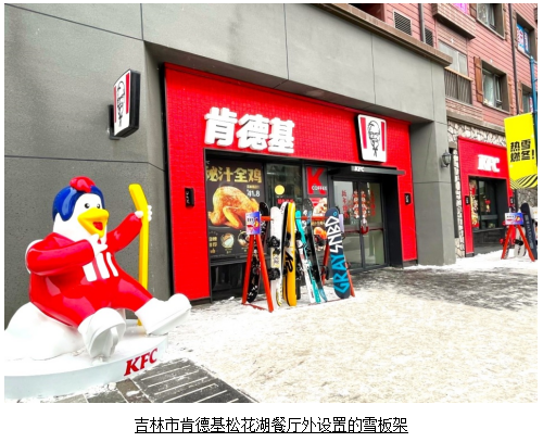 雪场旁的肯德基餐厅里,滑雪爱好者在消耗卡路里后,一份热气腾腾的餐食,让滑雪爱好者恢复能量、电力满格。在肯德基长白山餐厅、北大壶餐厅、松花湖餐厅外,滑雪爱好者们惊奇地发现,餐厅外增设了雪板存放架,进餐厅就餐,只需要将厚重的雪板暂存在架子上,即可轻松自在地进入餐厅就餐。