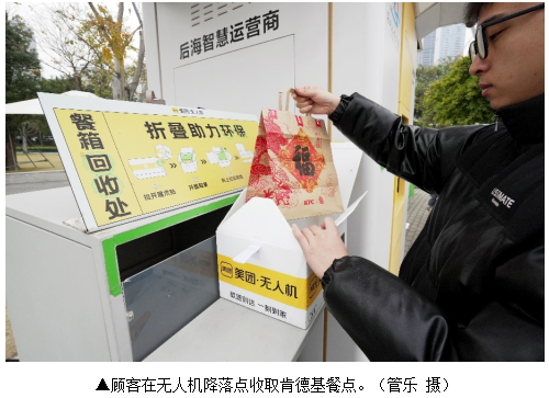 甲辰龙年即将到来之际,肯德基与美团无人机达成合作,成为首个上线无人机配送的西式快餐品牌。顾客在深圳人才公园、深圳北站周边HBC汇隆中心及鸿荣源天俊商圈的无人机降落点预订肯德基外卖,即可选择无人机配送,餐品装箱起飞后几分钟,就能从肯德基新中航天逸店和新保利店送达顾客手中。未来,随着更多门店上线,该服务将会覆盖高校、社区等更多场景。
