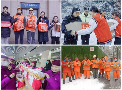 在火车站,在寒风中为旅客服务的站内工作人员及志愿者们接过热腾腾的年饭时,疲惫的脸上露出了笑容;在黄鹤楼景区,正在迎接全国各地游客的文旅值班人员收到了年饭,表示更有干劲, “竭尽全力服务好大家”;在地铁站,正全力保障安全运营、融雪除冰的员工们收到了年饭;在江岸区,正在冒雪连夜抢险的环卫工人也收到了暖心早餐……