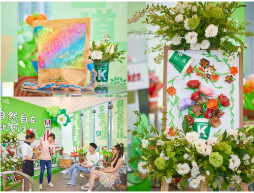 无锡肯德基雪浪小镇DT餐厅内一派生机盎然的景象:一纸飞花满春光,零碳小绿杯变身立体贴画艺术品,餐垫纸做的花瀑“奔流而下”,与小绿杯中“生发”的花朵交相呼应,寓意自然零碳,好事“花”生。