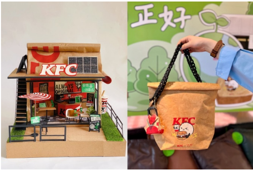 杭州的手工博主Zoe妈妈,通过使用肯德基牛皮纸餐袋、“小绿杯”、汉堡盒、小食盒、咖啡吸管等物料,制作了微缩版的杭州肯德基“小绿店”,这件作品通过还原“肯德基小绿店”招牌、太阳能遮阳伞、咖啡渣再生皮革抱枕、低碳竹材桌椅等细节,充分展现肯德基低碳绿色生活与循环利用的环保理念。